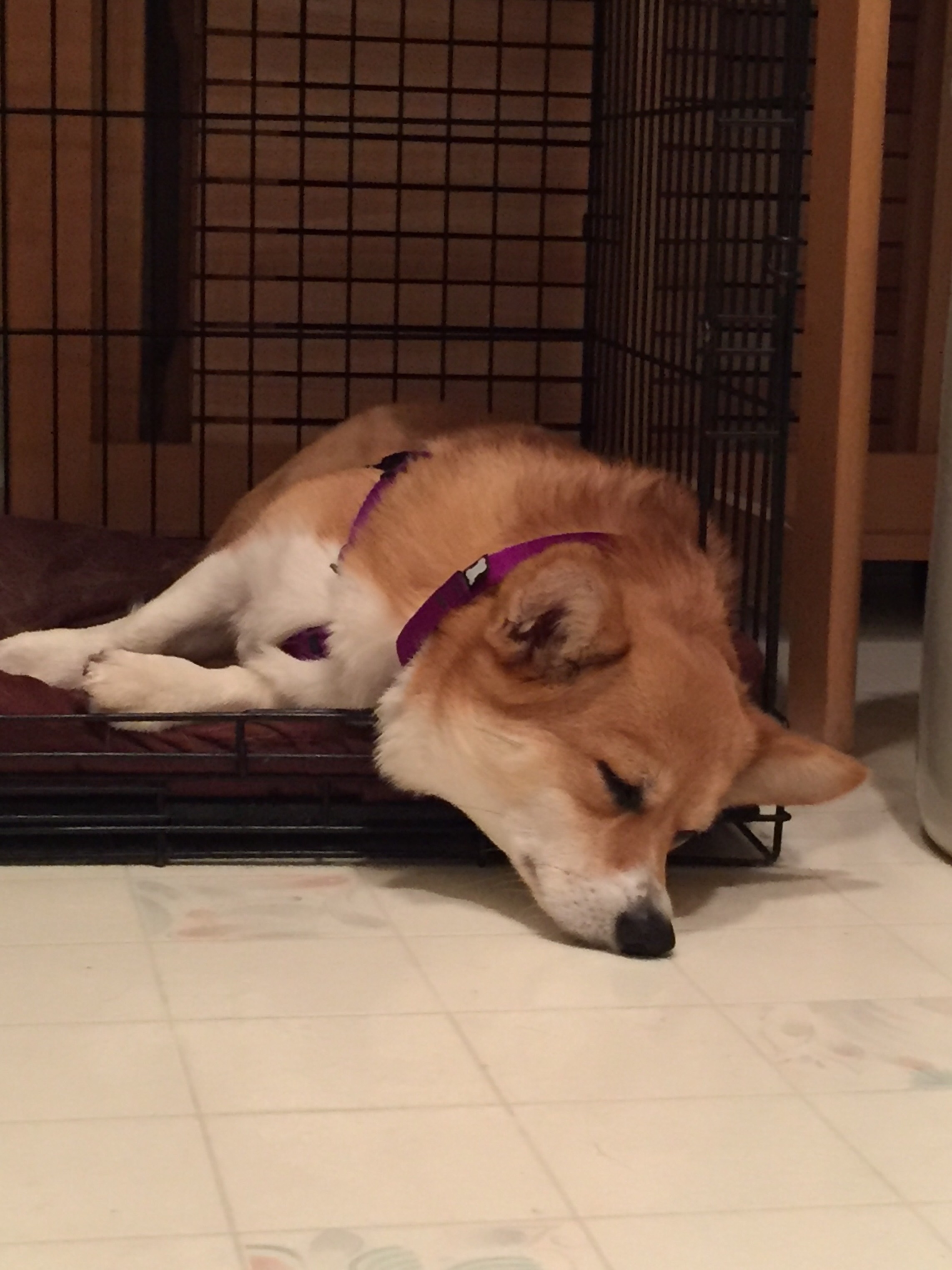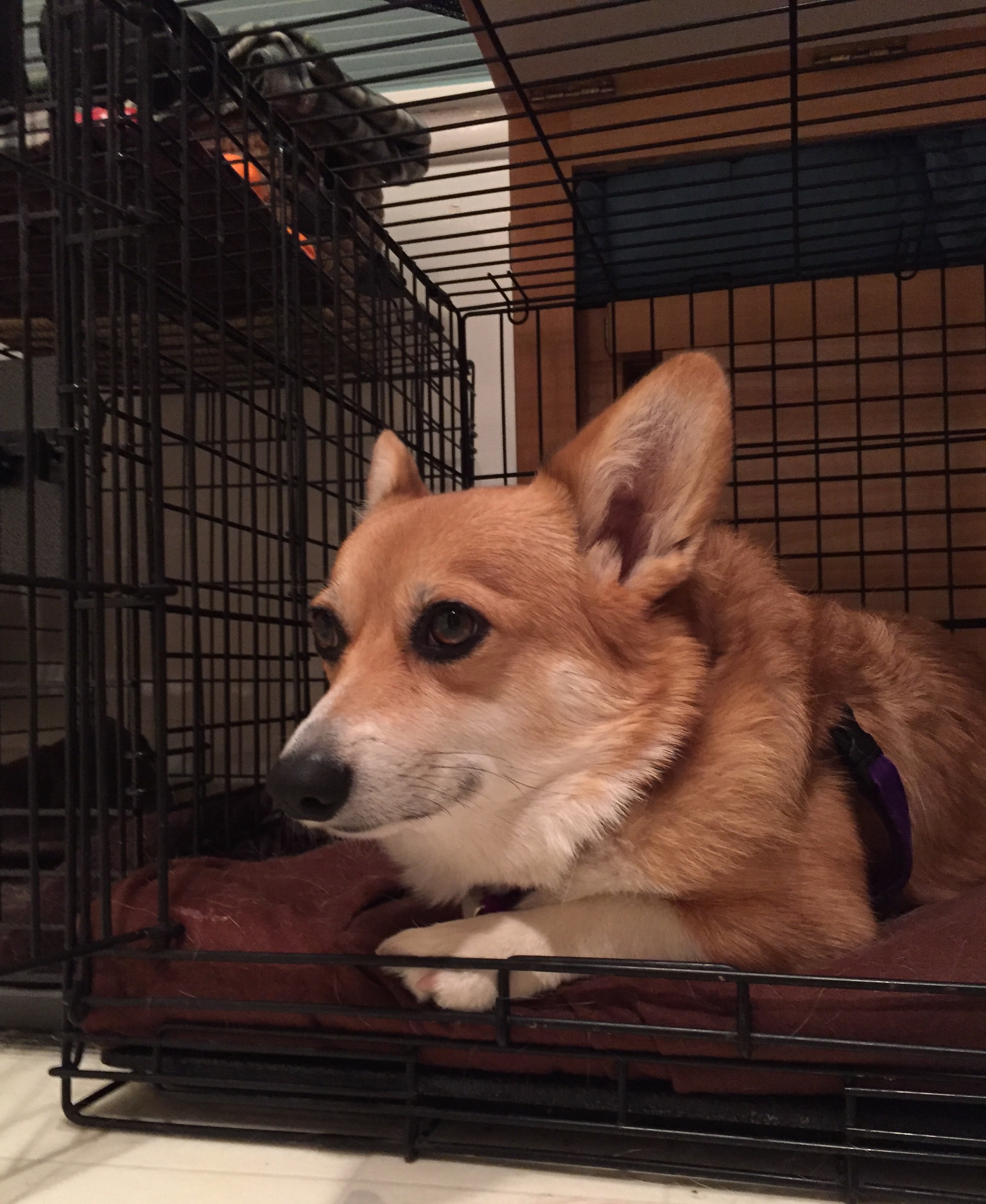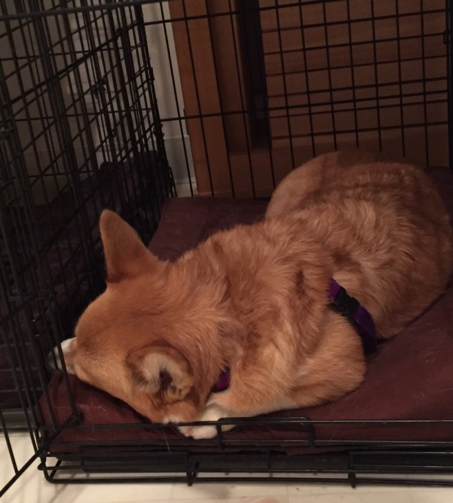 Life at corgiranch can be exhausting. Play all day, come home, play Squishy Face with mom, do some training, eat dinner. So what is a girl to do after all that? Walk over to her bwthyn, open the door herself and sit in front of the open crate and stare at mom until mom says “bwthyn”. Then – and only then – can she go into her crate and crash. Funny funny girlie.